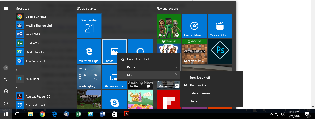 It opens with ‘live tiles’. If you right click on a tile you get a drop down menu: