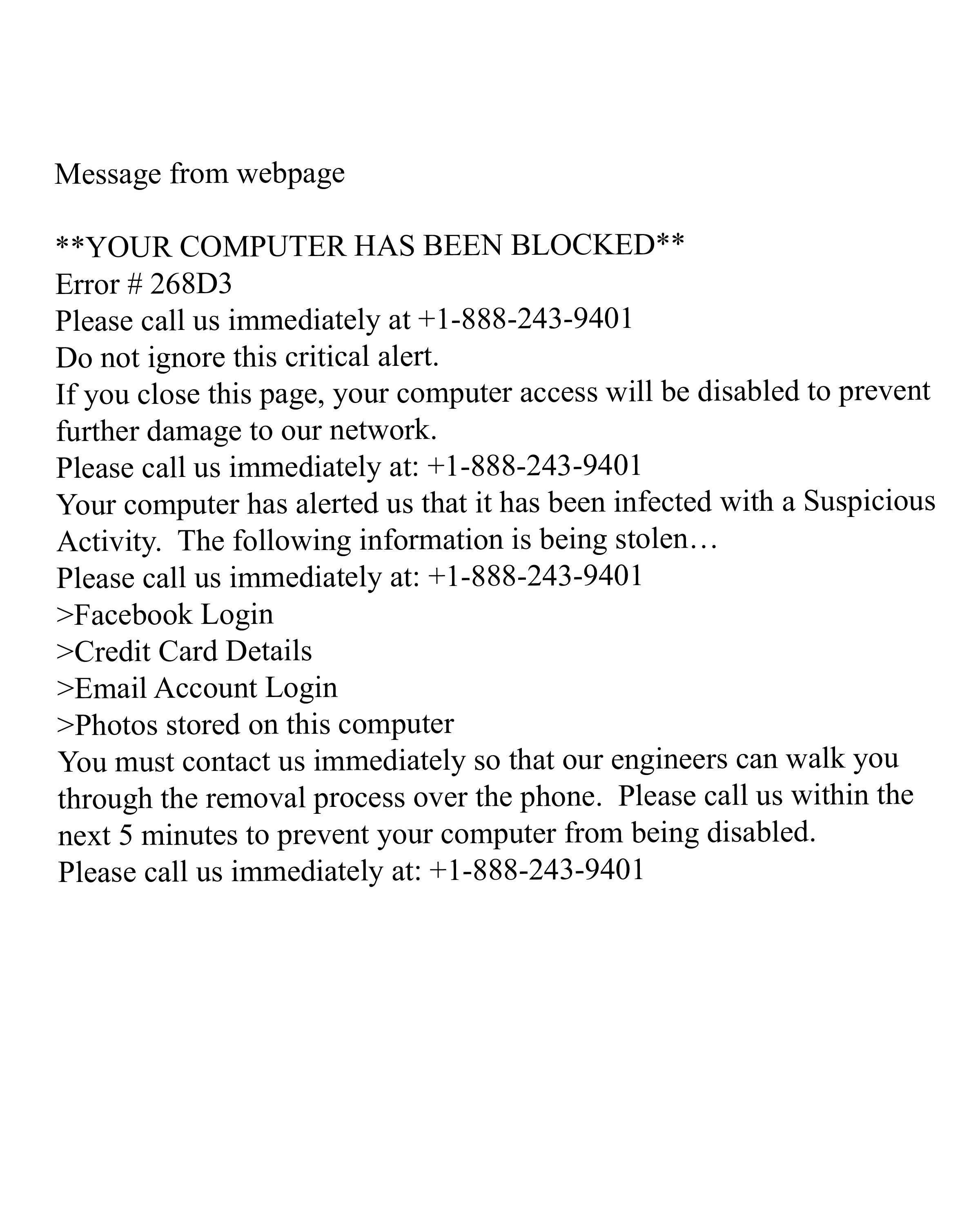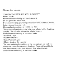 This is a virus or a scam. Whichever word you want to use for it. Note the urgency relayed in the message and how they want to ‘walk you through’ the process. What they really want to walk you through is how to let them further infect your computer!