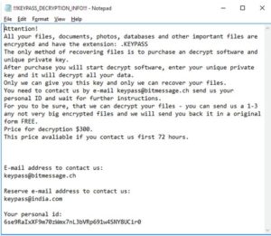KeyPass ransomware was first discovered on August 8th and has been infecting computer since. KeyPass will encrypt your entire file system and you will get a note that looks like this: