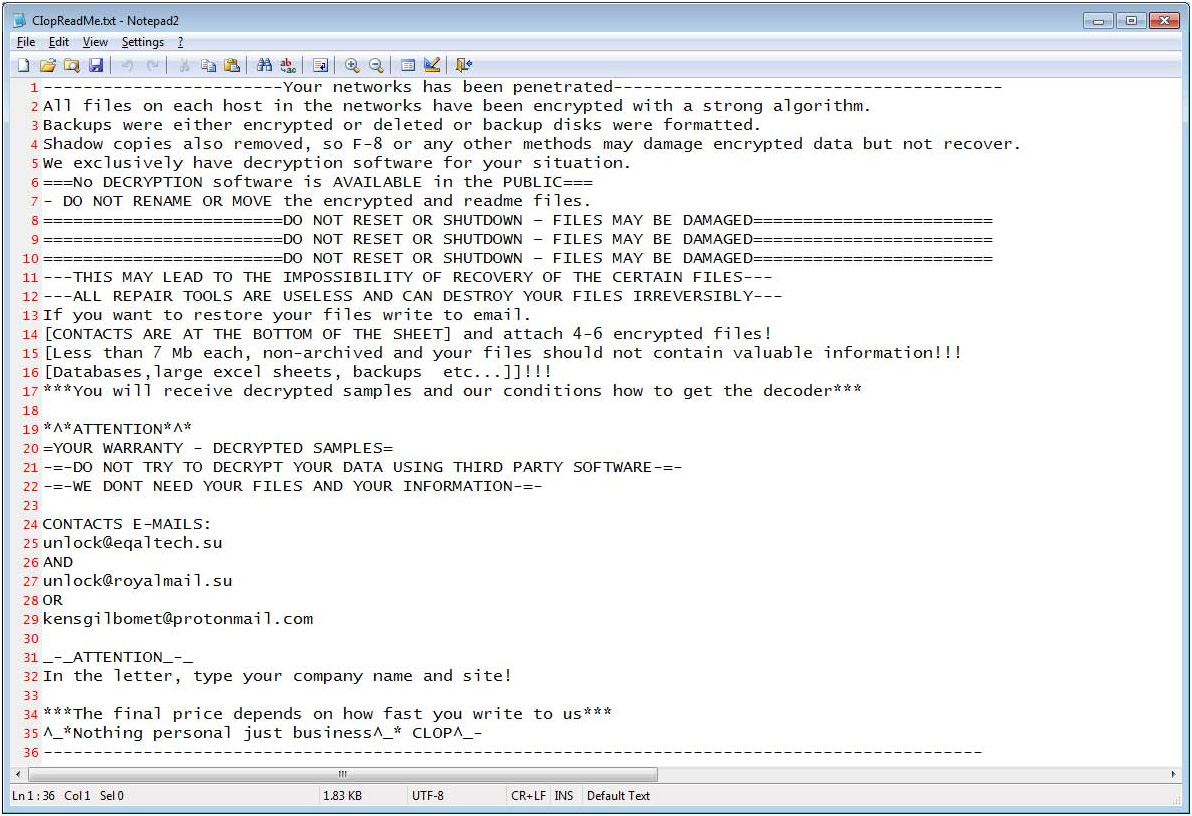 After being installed, it will stop processes and disable antivirus software. Soon it will close everything out and start encrypting data. File names will end with .CLOP or .CIop for example picture.jpg.CLOP.